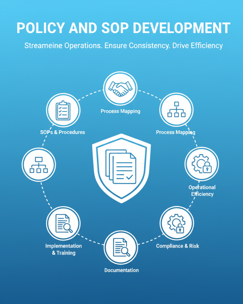 We assist organizations in drafting clear, concise, and legally compliant policies covering areas such as HR, Finance, IT, Procurement, Anti-Bribery, Whistleblower, Data Protection, and Ethics. Our experts ensure that policies are not just documents but actionable guidelines that support governance and cultural values. - SOP Development & Documentation