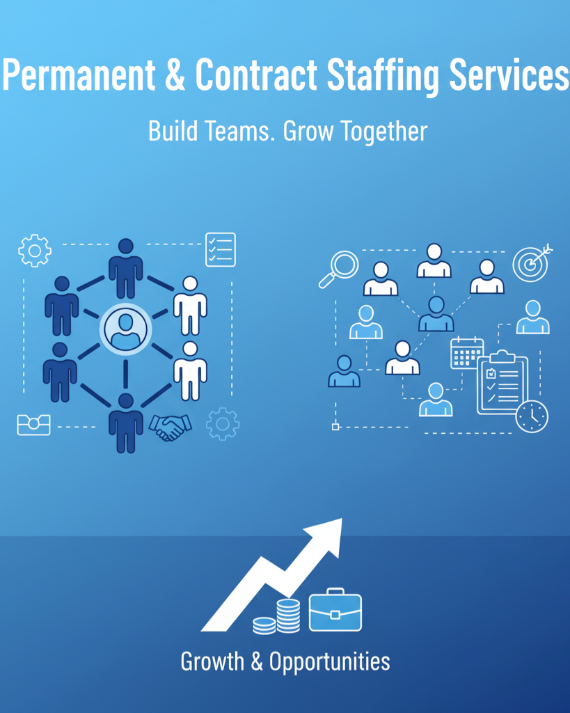 We help you hire full-time professionals who align with your company culture, business objectives, and long-term vision. From entry-level roles to executive positions, we ensure the right fit through targeted search, deep domain knowledge, and a rigorous evaluation process. - Contract Staffing