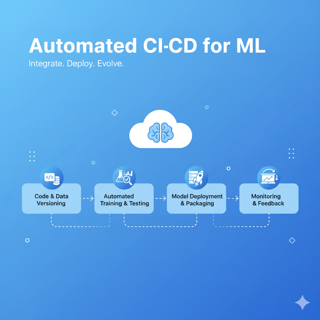 Automated CI/CD for ML is the engineering discipline that applies the principles of Continuous Integration and Continuous Delivery specifically to machine learning workflows. It involves creating automated pipelines that handle the entire ML lifecycle—from code changes and data validation to model training, testing, versioning, and secure production deployment. This service ensures that every change (code, data, or configuration) triggers a complete, repeatable process, significantly reducing manual errors, accelerating the model release cycle, and maintaining the quality and reliability of models in production. By integrating testing and governance checks throughout the process, it enables rapid, safe iteration and continuous business value delivery from AI assets.