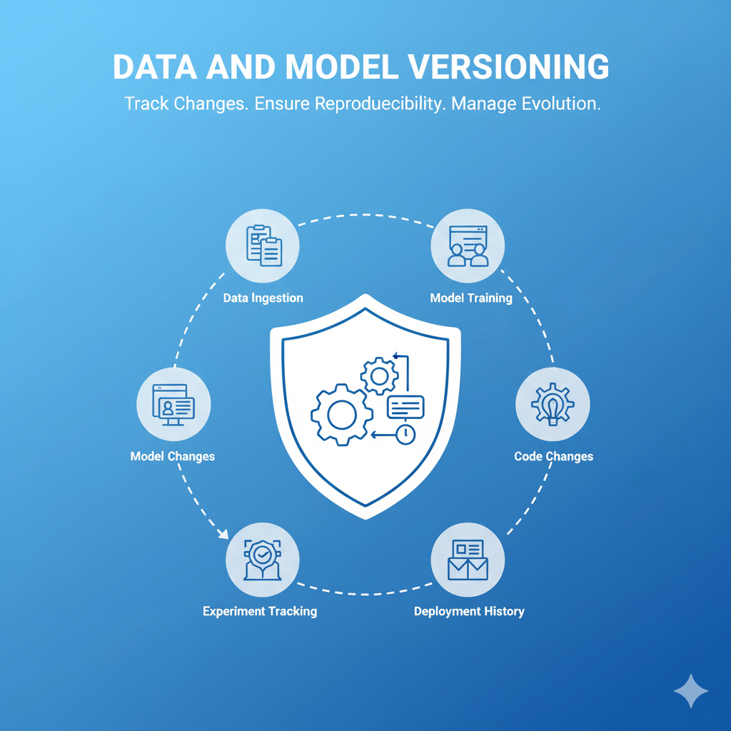 Data and Model Versioning is the critical practice of tracking and managing every component involved in the machine learning lifecycle: the datasets, the model code, the training configuration, and the resulting trained model artifacts. This systematic approach ensures reproducibility, auditability, and governance. By versioning data and models, organizations can accurately pinpoint which data set was used to train a specific model version deployed in production, making it easy to roll back to a known working state, comply with regulatory requirements, and debug performance issues. It transforms the often chaotic nature of ML experimentation into a standardized, traceable engineering process.