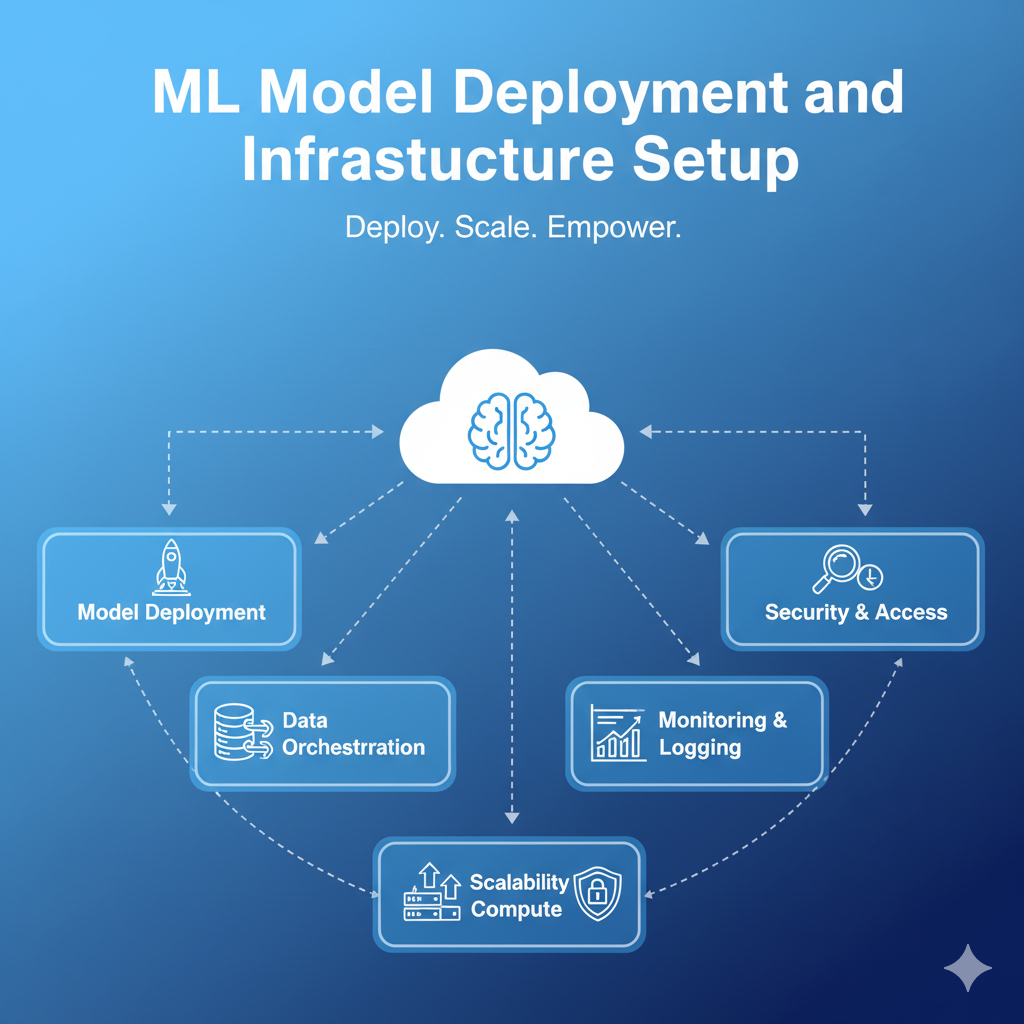 ML Model Deployment and Infrastructure Setup is the critical process of transforming a trained machine learning model from a development environment into a production system where it can deliver real-time or batch predictions to end-users and applications. This service focuses on building the scalable, reliable, and secure infrastructure necessary to host and serve the model effectively. It includes selecting the right cloud environment, containerizing the model, configuring API endpoints, implementing load balancing for high throughput, and integrating the prediction service seamlessly into the client’s existing application ecosystem. A robust setup ensures minimal latency, high availability, and efficient resource scaling, maximizing the return on investment from the model development phase.
