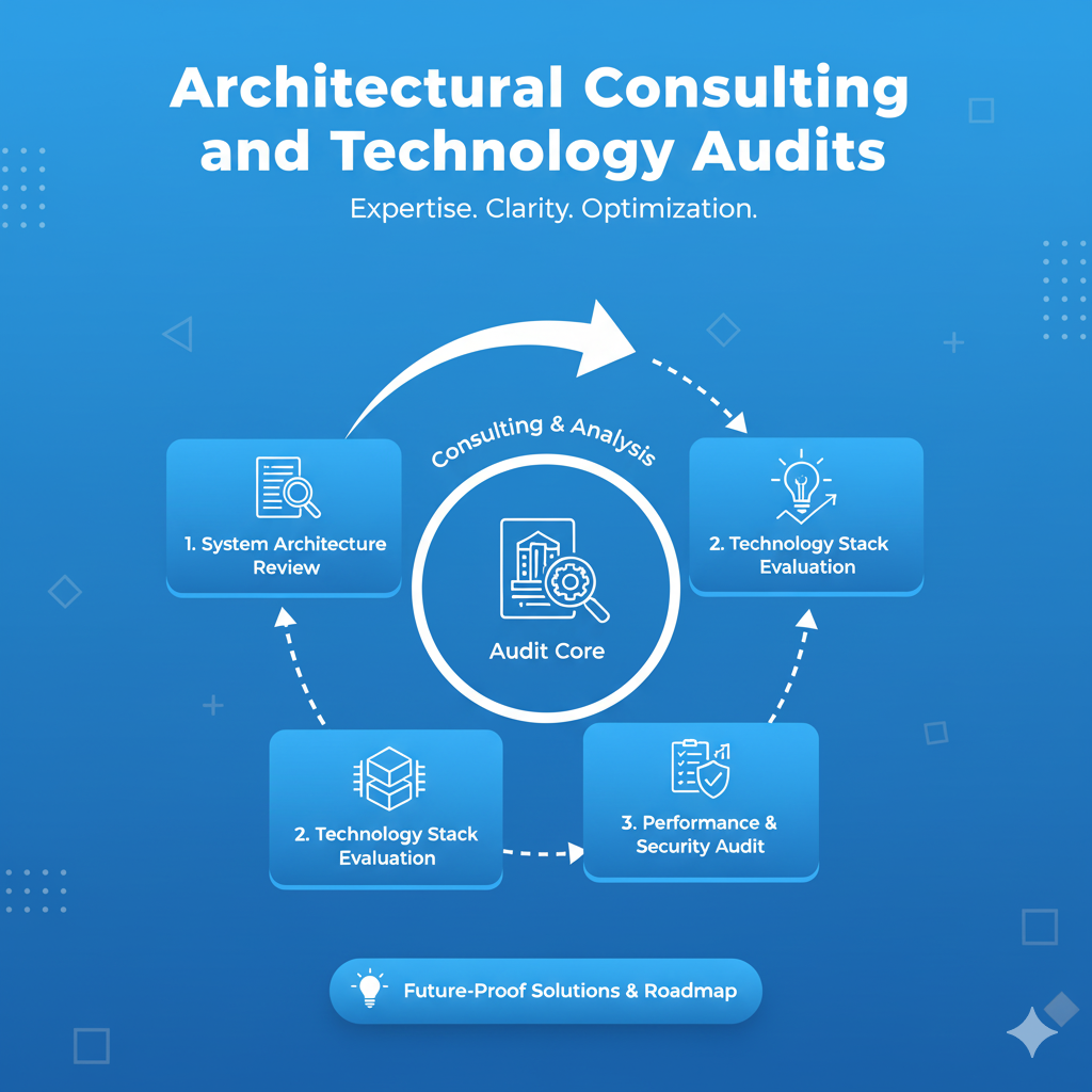 Architectural Consulting and Technology Audits is a specialized service focused on evaluating, optimizing, and strategizing a company’s technology landscape to ensure it efficiently supports future growth and business goals. Consultants analyze existing software, systems, and infrastructure, assessing aspects like scalability, security, cost-efficiency, and technical debt. The result is a clear roadmap that guides key decisions, such as selecting the right cloud environment, migrating from legacy systems, choosing the optimal technology stack, or preparing for high-volume transactions. This proactive approach minimizes future risks and maximizes the return on technology investment.