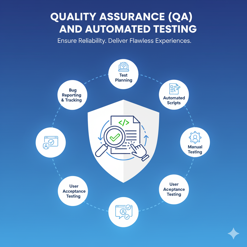 • Quality Assurance (QA) and Continuous Testing We implement a rigorous QA strategy encompassing manual and automated testing, including unit, integration, functional, and performance testing, to ensure the application is reliable, secure, and bug-free before every release.